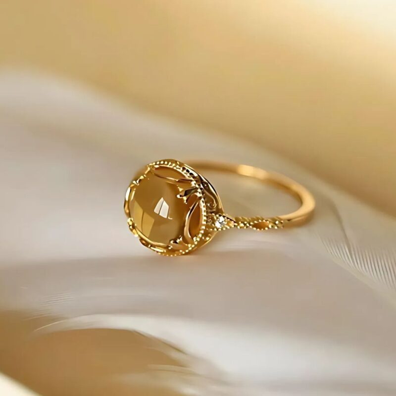 Un diseño etéreo con piedra nacarada central y acabado dorado con detalles florales. Este anillo es perfecto para quienes buscan una joya con luz propia, sutil y encantadora.