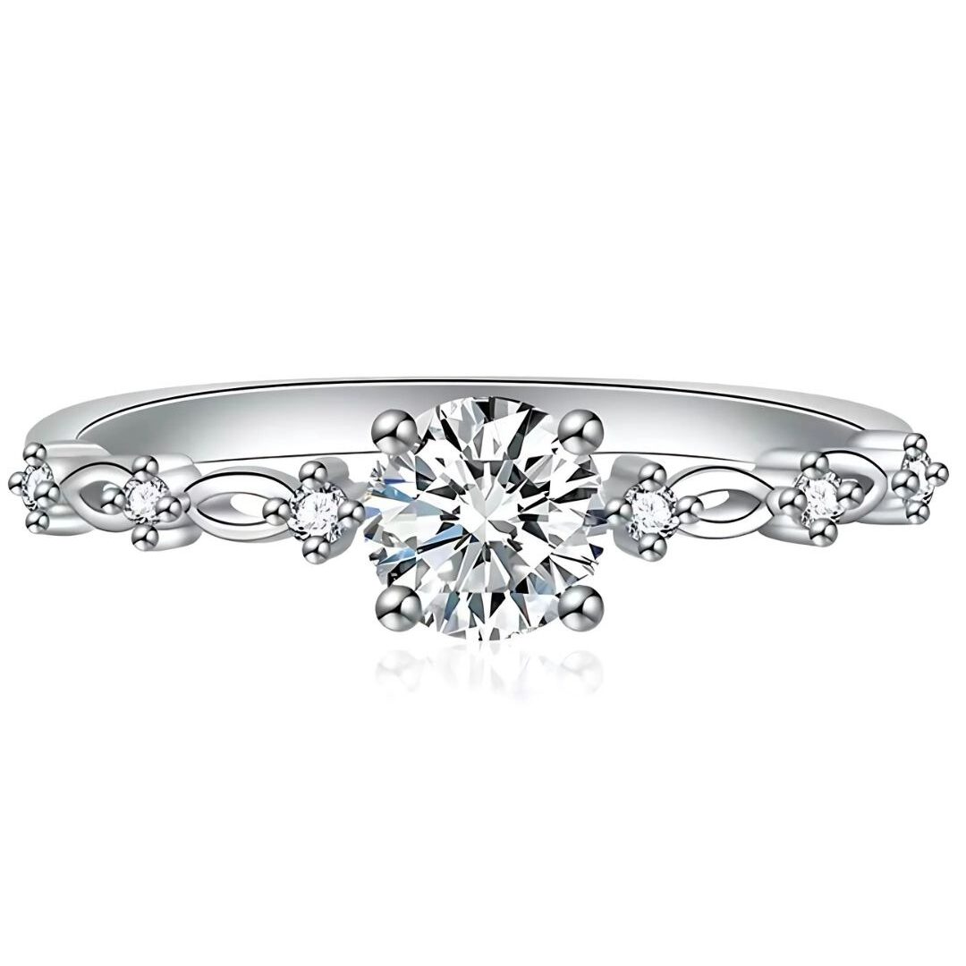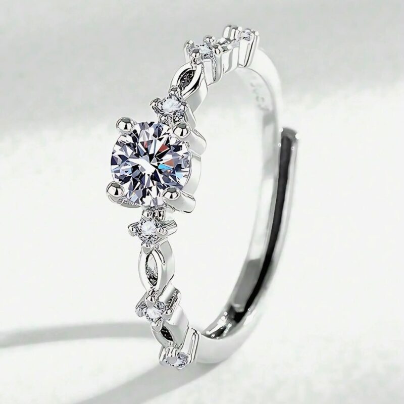 Anillo con una moisannita central que captura la luz, enmarcado por trenzas de plata con detalles brillantes que evocan la eternidad.