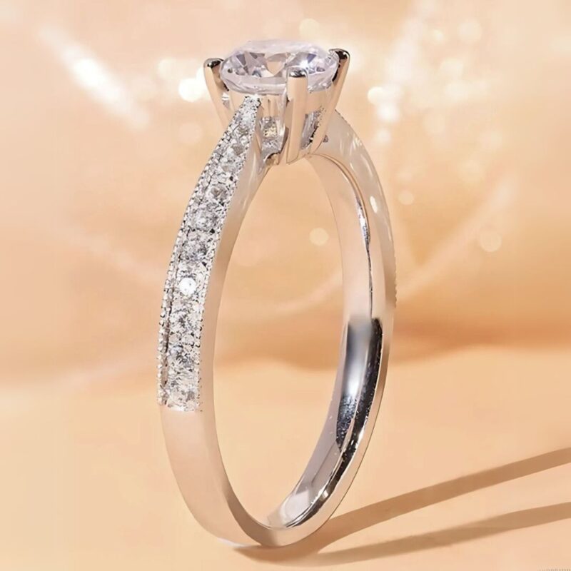 Anillo con moisannita central que irradia luz suave, enmarcado por una banda de plata con una curva elegante y detalles brillantes.