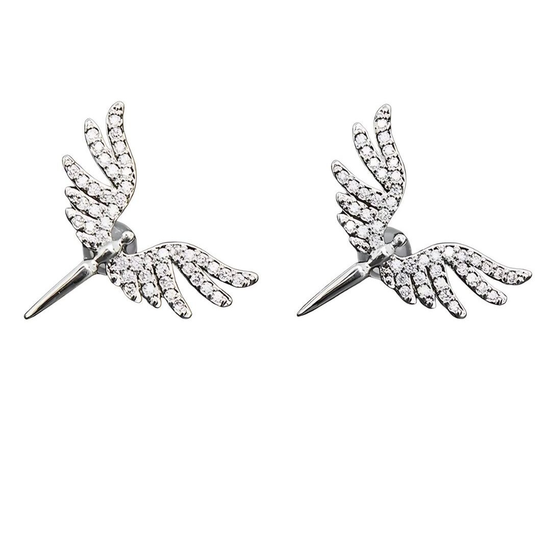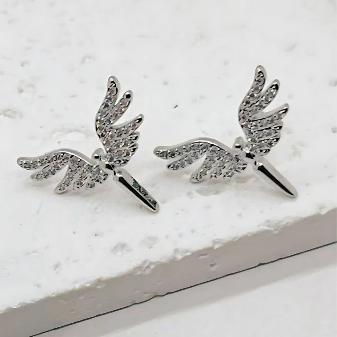 Aretes de alas detalladas, adornadas con zirconias brillantes, que evocan la pureza y protección angelical.