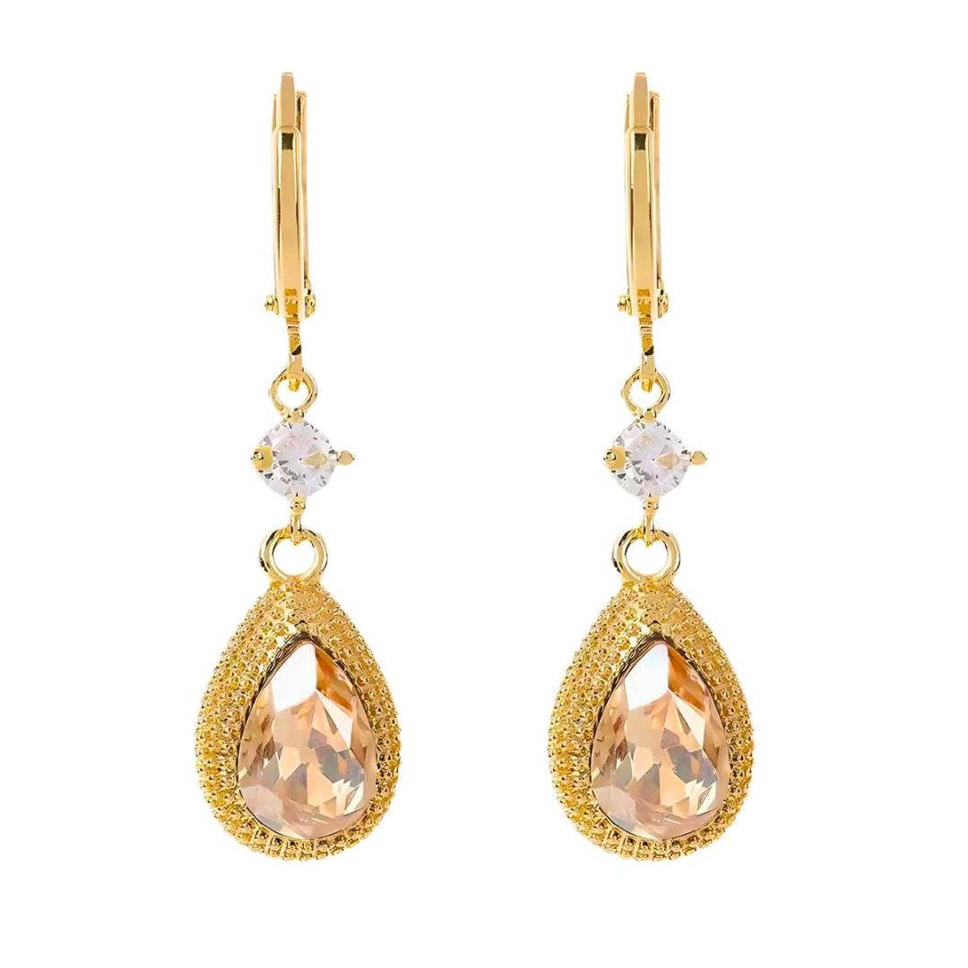 Destaca tu estilo con estos aretes dorados con cristal en tono champagne y zirconia brillante. Diseño sofisticado, ligeros y cómodos para usarse todo el día.