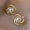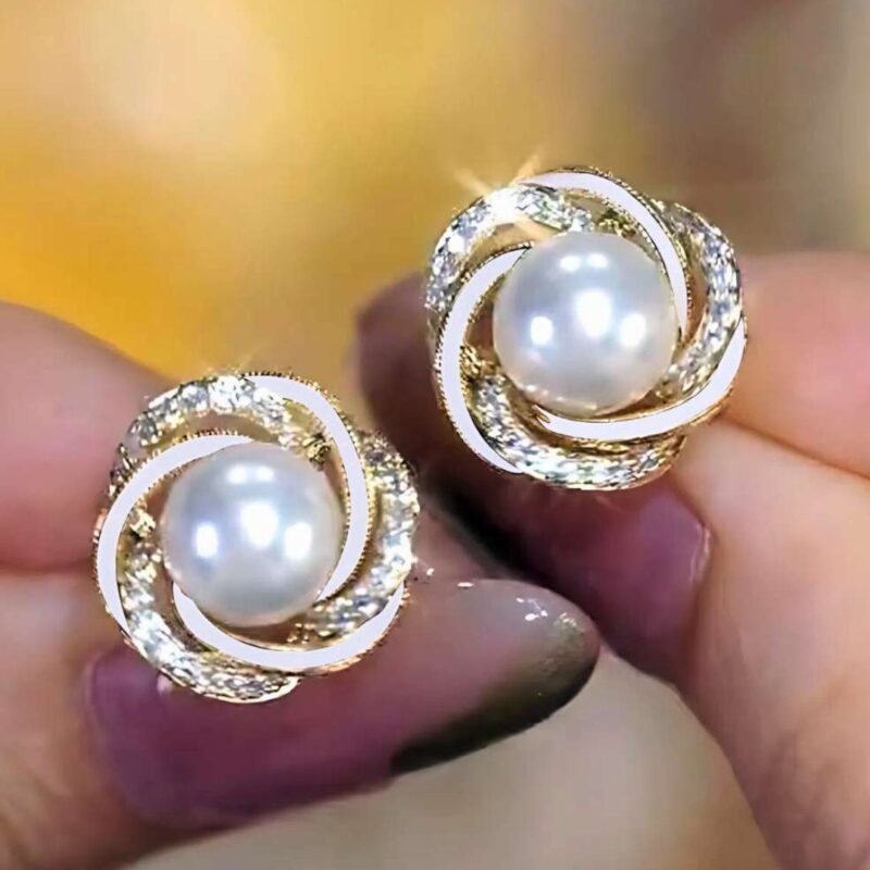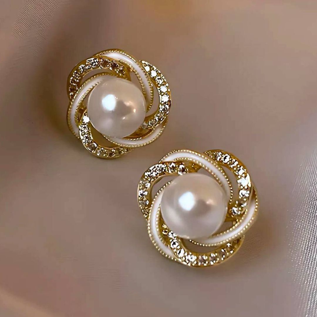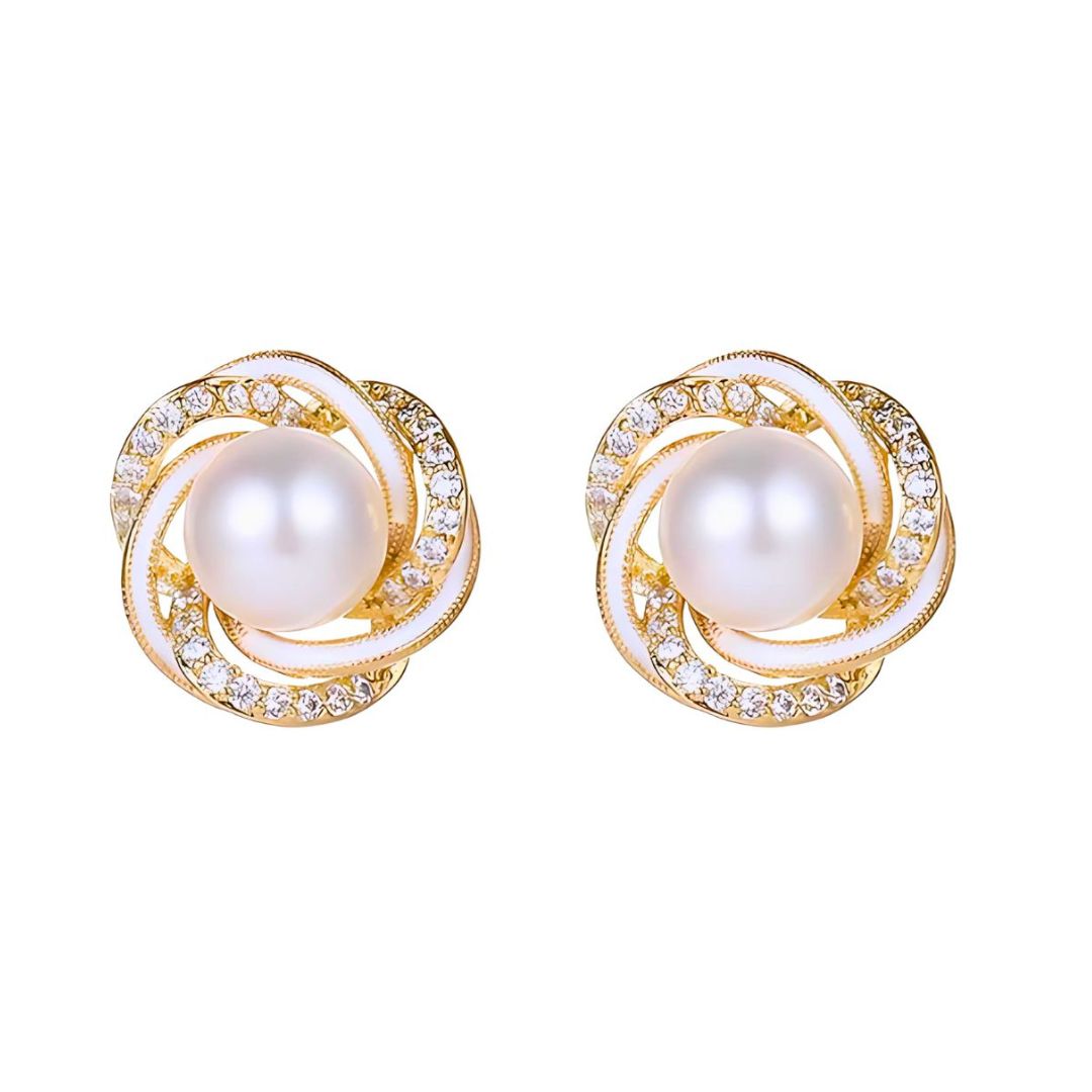 Aretes tipo botón con perla central y diseño entrelazado con zirconias. Ideales para un estilo femenino, delicado y elegante en cualquier ocasión.