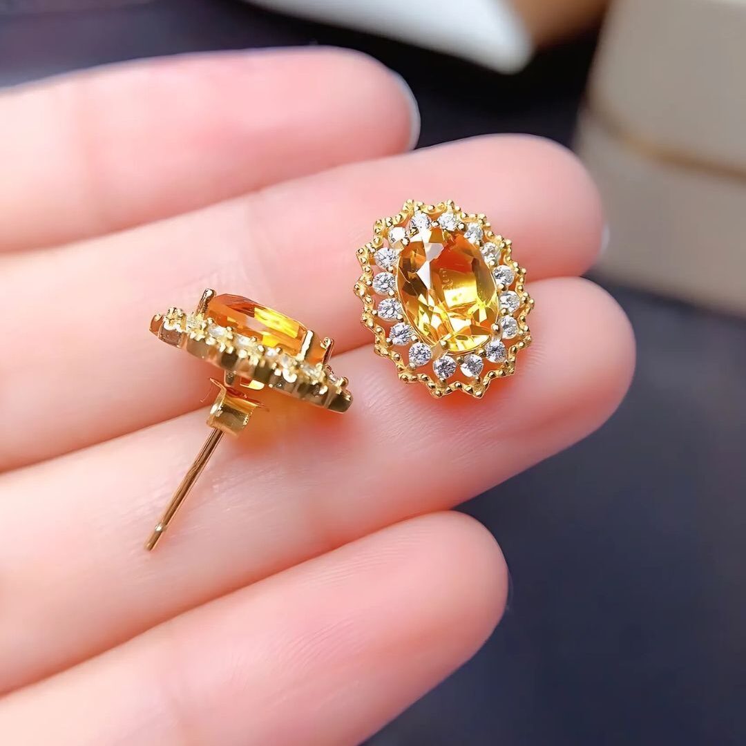 Aretes ovalados con citrinos dorados centrales, rodeados de zirconias brillantes, evocando la calidez de un atardecer real.