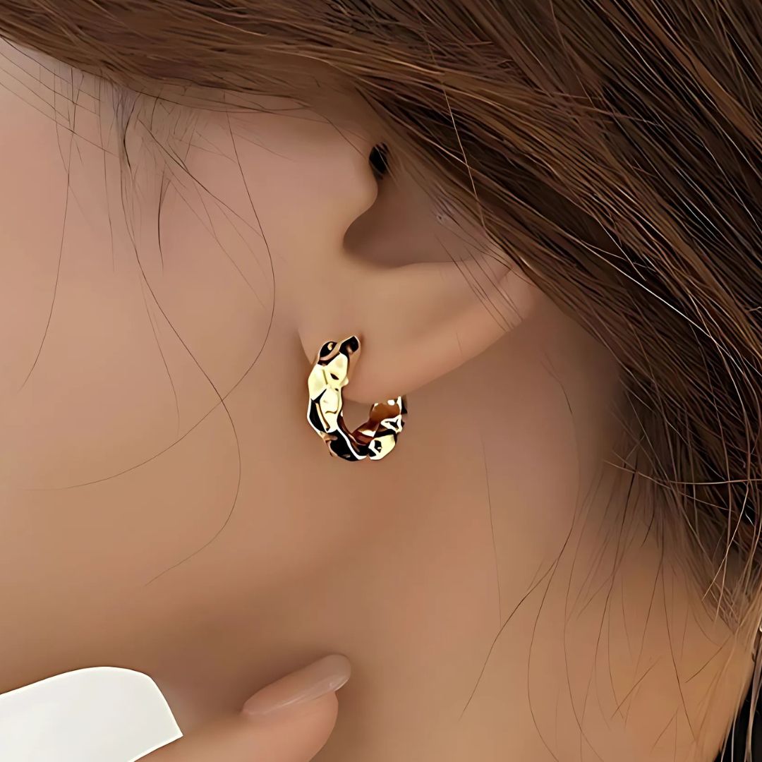Aretes dorados con diseño ondulado y acabado brillante. Una pieza moderna y versátil que destaca por su textura fluida y original. Ideales para un look contemporáneo y elegante.