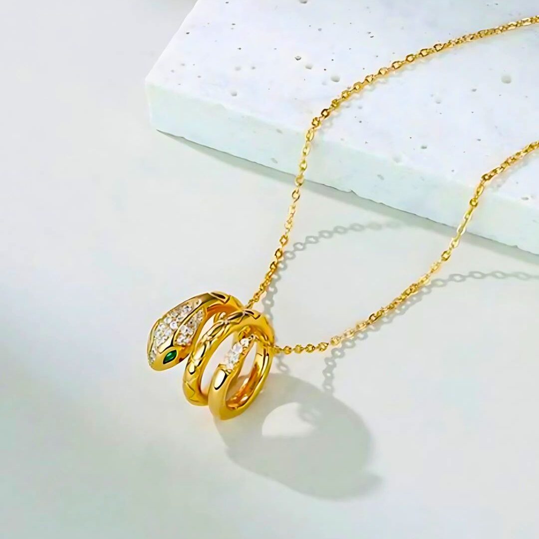 Un collar que combina la elegancia con un toque exótico, presentando una serpiente dorada con detalles de zirconias y ojos de gema verde.