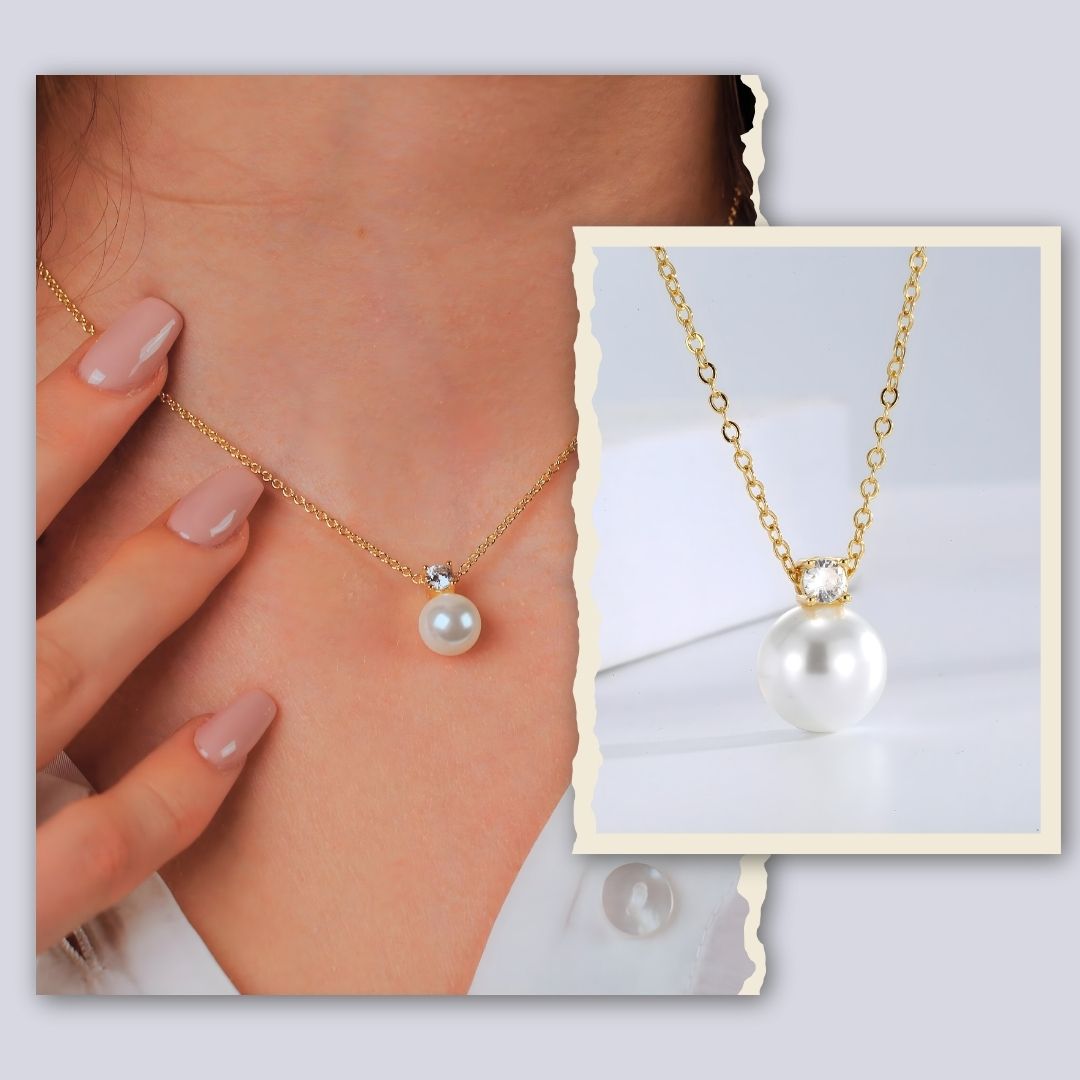 Una perla blanca y luminosa suspendida de una delicada cadena dorada, coronada por una zirconia brillante en montura de garra. Un diseño minimalista y atemporal, perfecto para lucir solo o sobre cualquier escote.