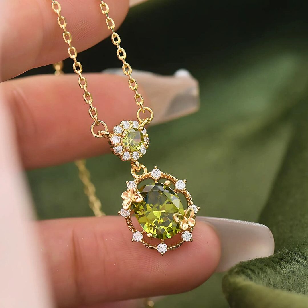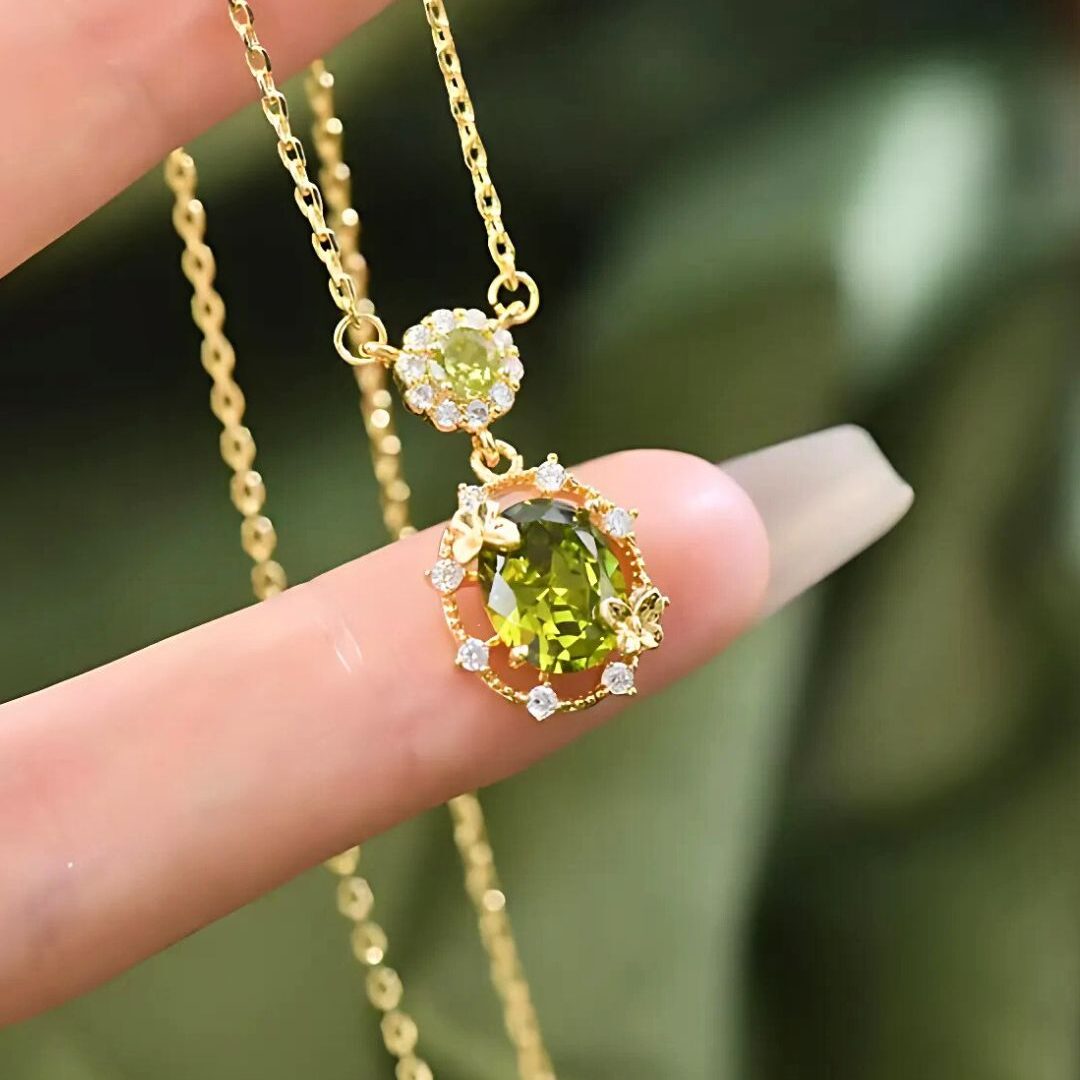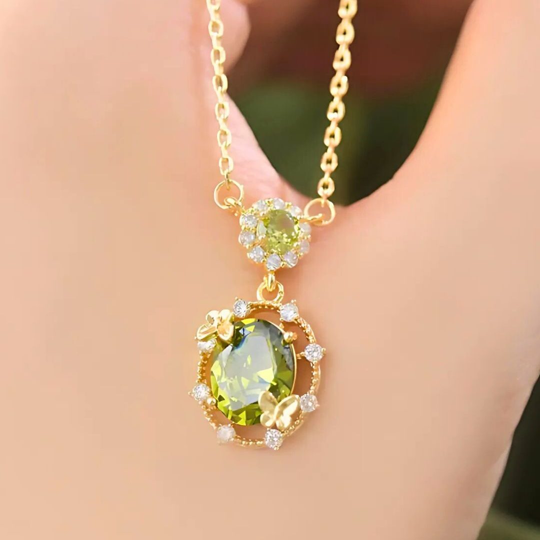 Un collar que destaca por su gema central de peridoto, rodeada de detalles brillantes y pequeñas mariposas, coronada por zirconias superiores que añaden el toque final de elegancia y brillo.