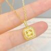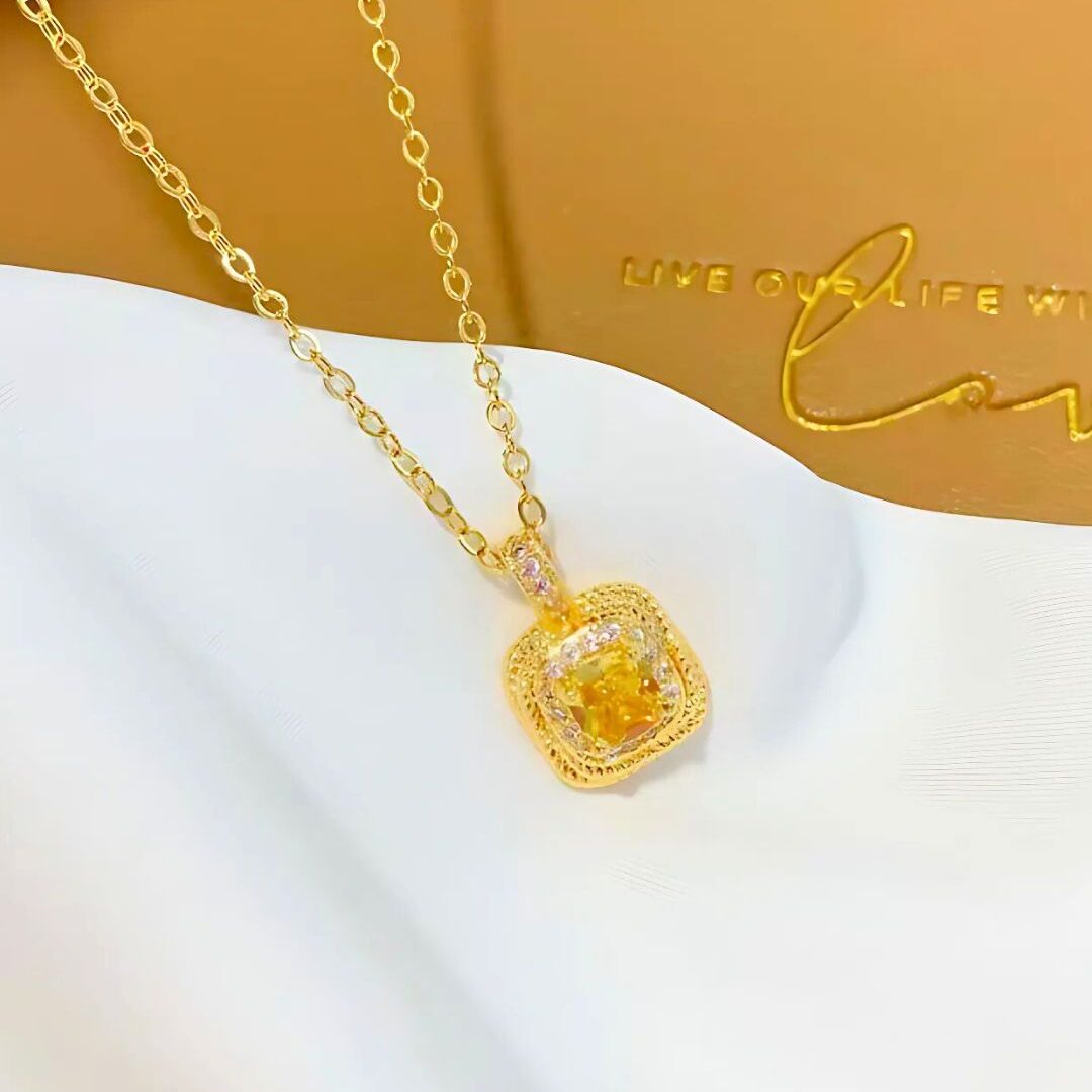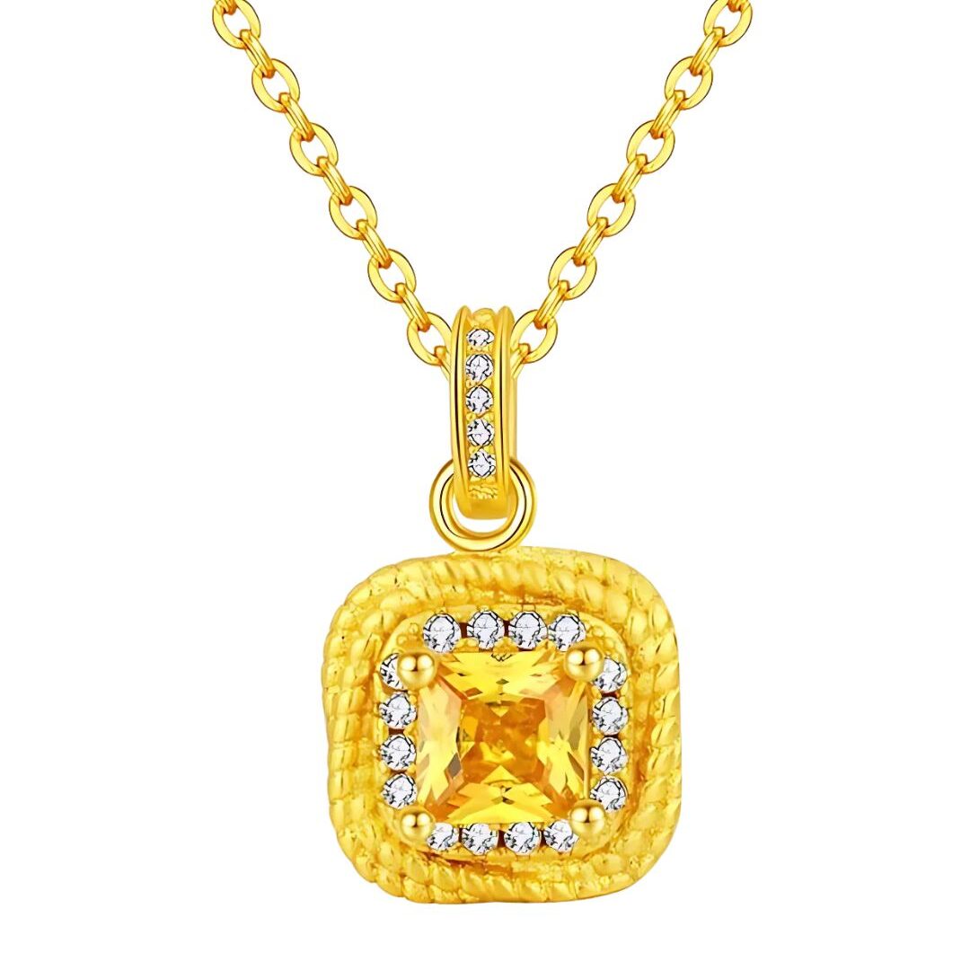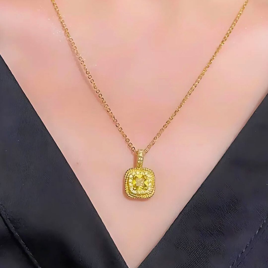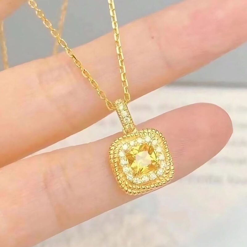 Un collar que destaca por su gema amarilla central, rodeada de circonitas que simulan un halo solar, ideal para un look luminoso y elegante.