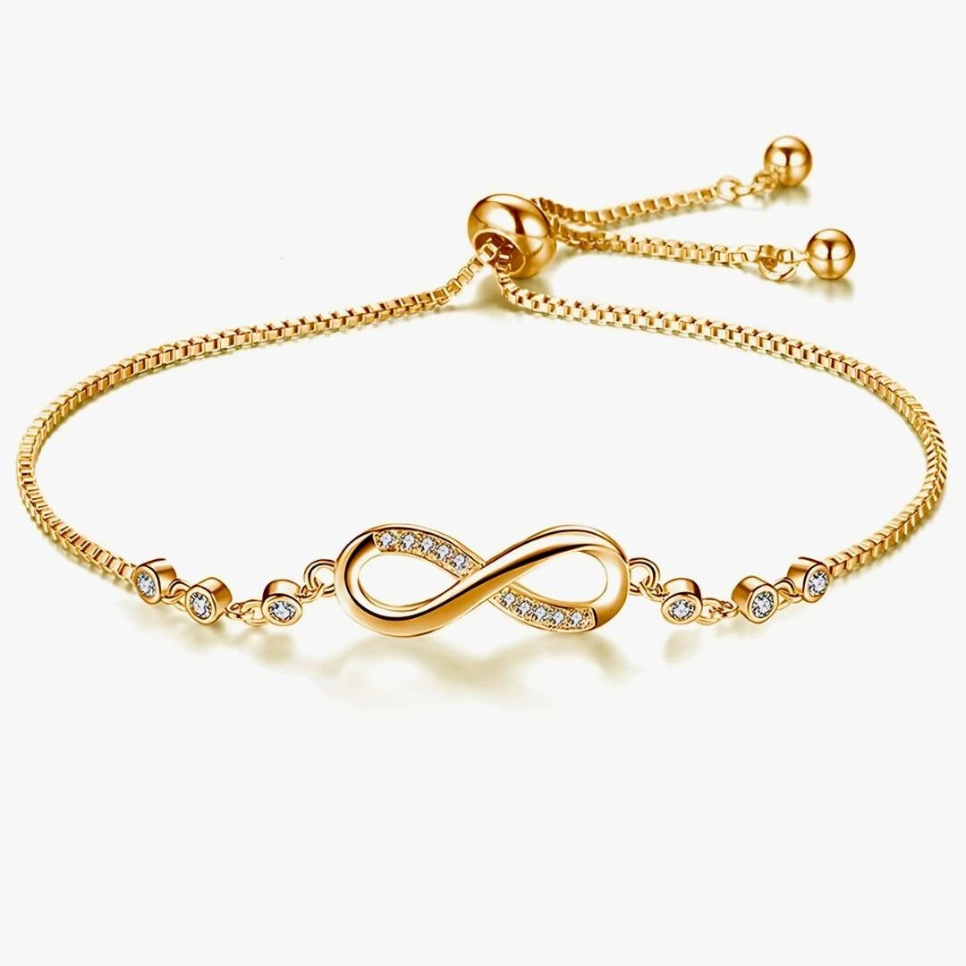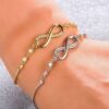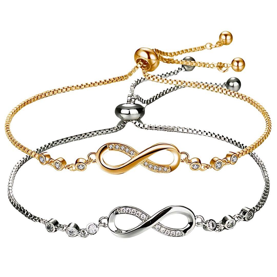 Pulseras gemelas que representan la unión infinita, con el símbolo del infinito en oro y plata, realzado por zirconias que capturan la luz con un brillo sutil.